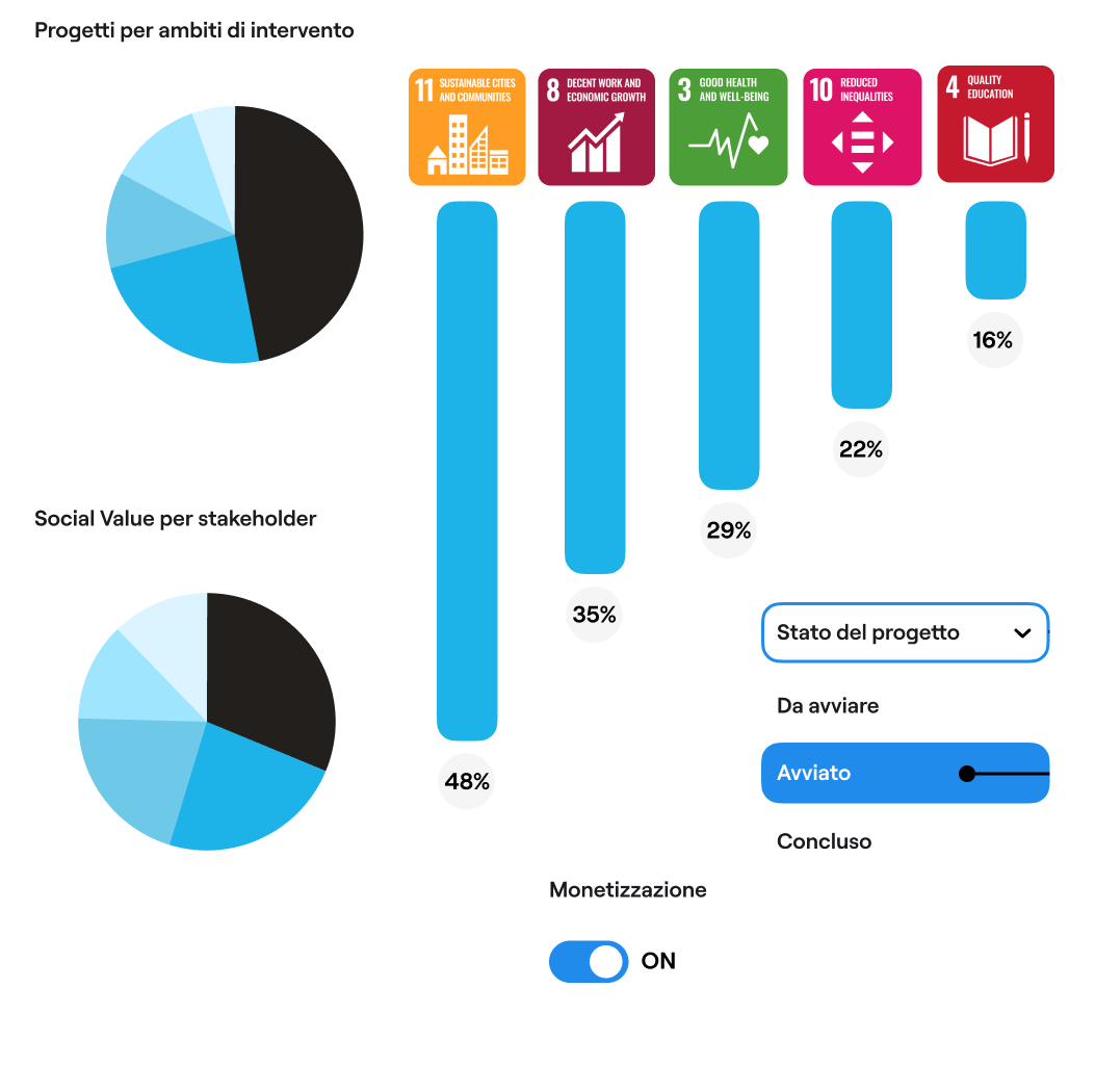 Impact Manager provides access to a series of digital, multi-sectoral and highly customisable solutions, capable of responding to the needs of every single organisation, from Third Sector organisations to Public Administrations, from companies that innovate their business to banks and financial operators that carry out major investments, up to foundations that support start-ups and local economies.