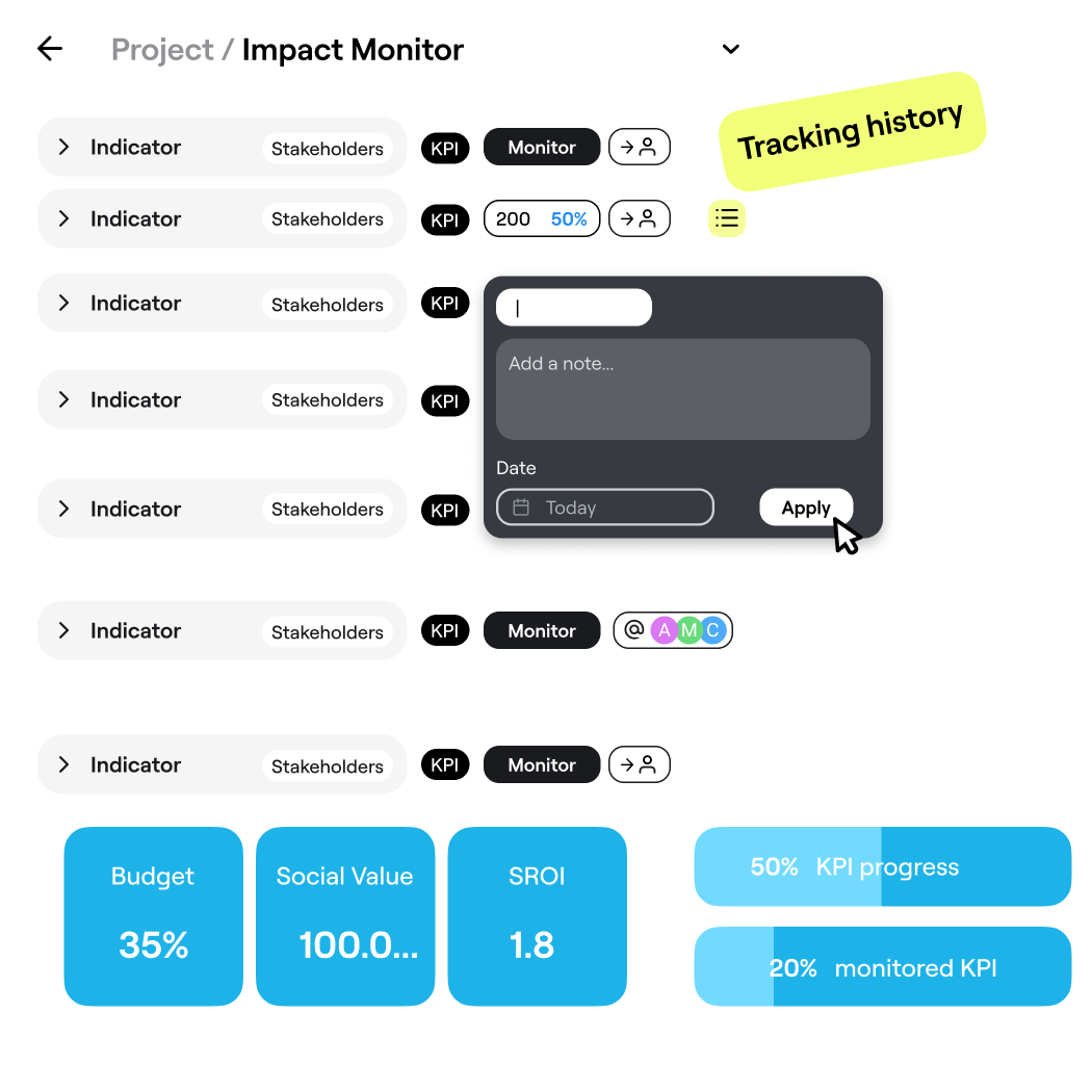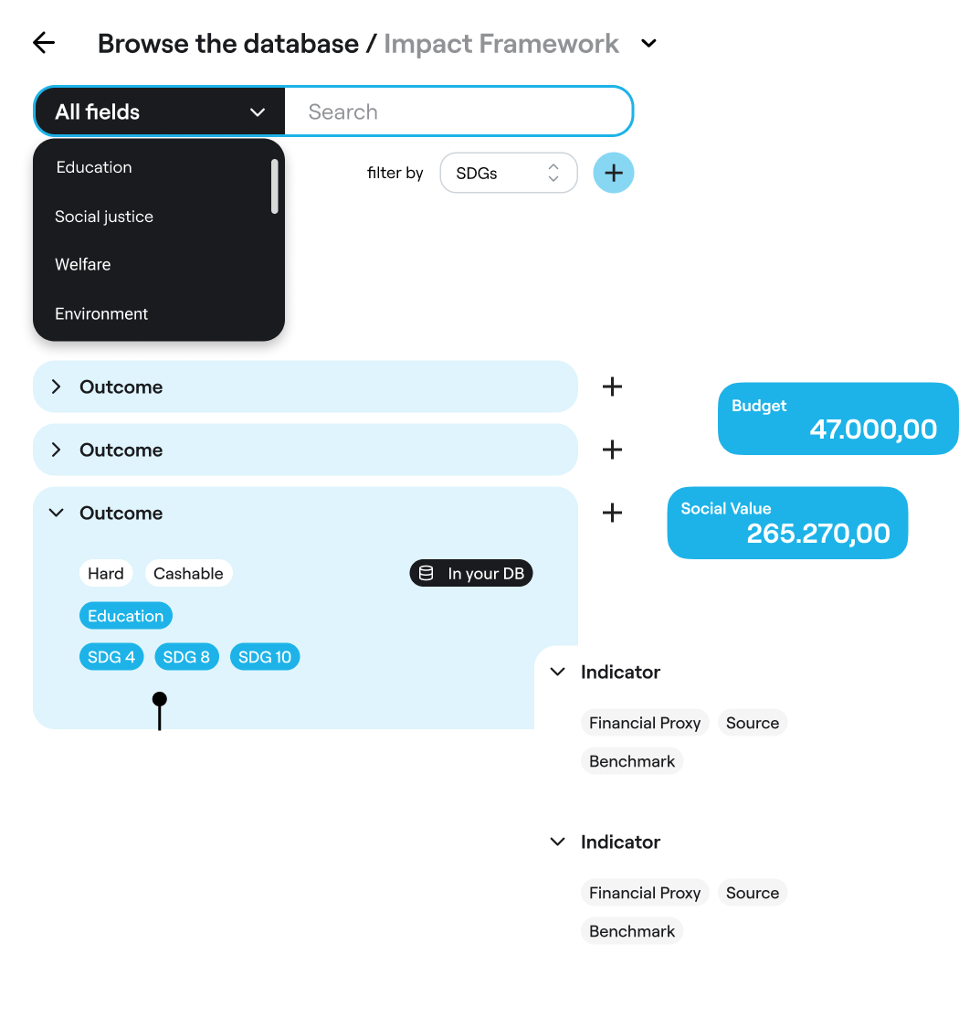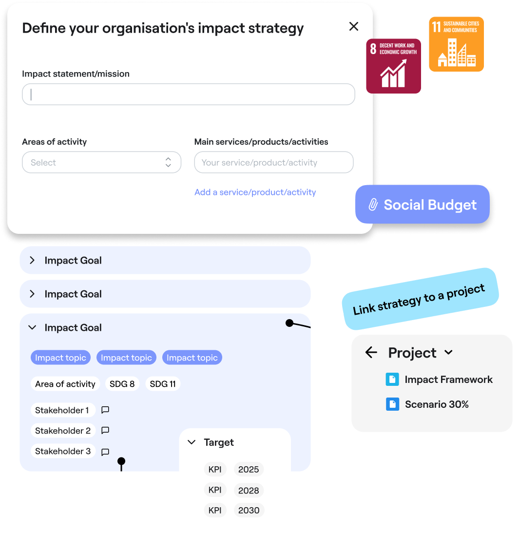 Map all activities, browse the Open Impact Database and define impacts for each stakeholder. Each of your impacts will be linked to a measurable KPI, based on real data.