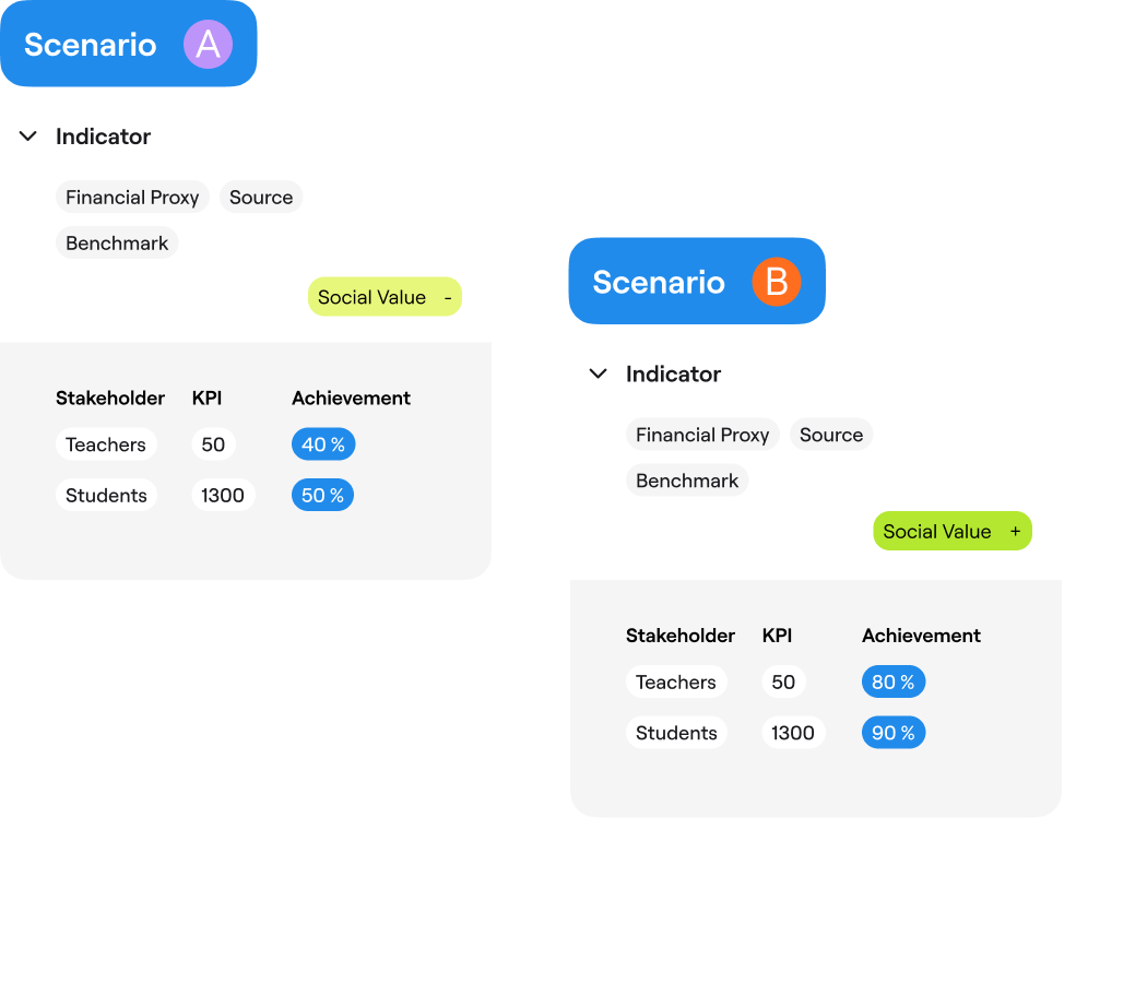 Quantify your impact KPIs in economic and financial metrics, applying the Social Return on Investment methodology.
