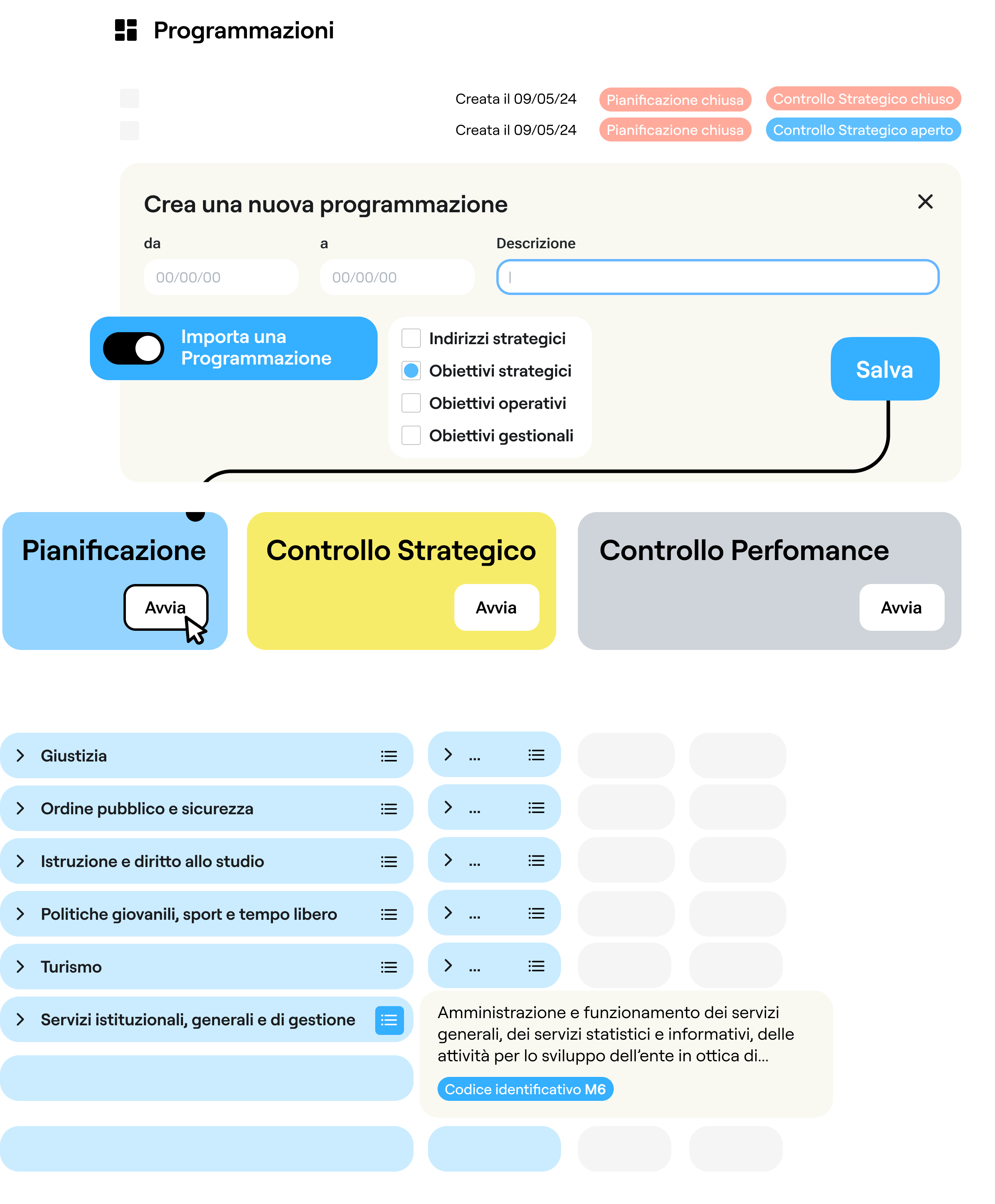 Il software permette di lavorare sulla Pianificazione guardando a Missioni e Programmi, Indirizzi Strategici e Obiettivi Operativi, tutti consultabili in pratiche finestre di sintesi e collegabili tra loro, permettendo una costante valutazione delle performance.
